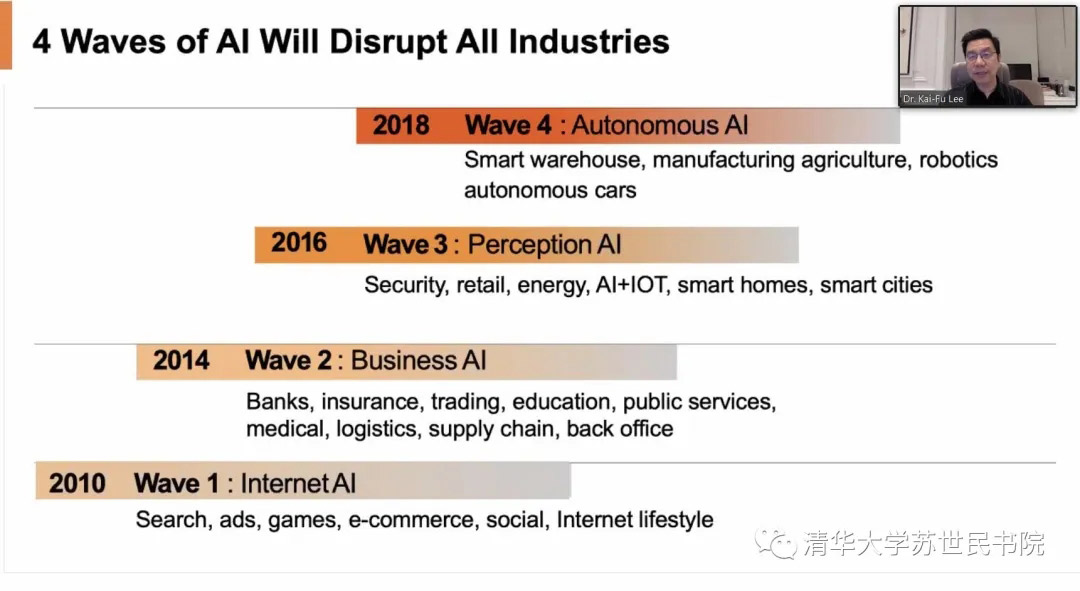 李开复首先概括中国在人工智能方面的成就,表示从电子支付方式的普及到共享单车的推广使用,从无人机技术的突破到智能翻译技术的创新,多角度地体现出中国在互联网智能化(Internet AI)、商业智能化(Business AI)、实体世界智能化(Perception AI)、全自动智能化(Autonomous AI)四次AI浪潮中的发展。