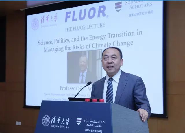 随后齐晔教授致欢迎辞。他感谢福陆公司对系列讲座和苏世民学者项目的支持,接着娓娓介绍了大卫·金爵士从科研工作者到政策发起者的工作历程。从2000年开始,大卫·金爵士担任布莱尔政府的首席科学顾问(GCSA),同时作为气候变化特使游说各国政府积极采取措施应对气候变化。他所发起的“创新使命”计划(Mission Innovation)旨在通过清洁能源技术的研发,促进世界向零化石燃料经济的转型。