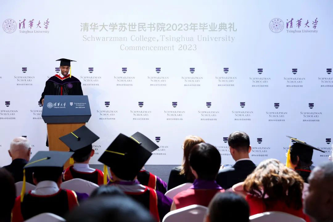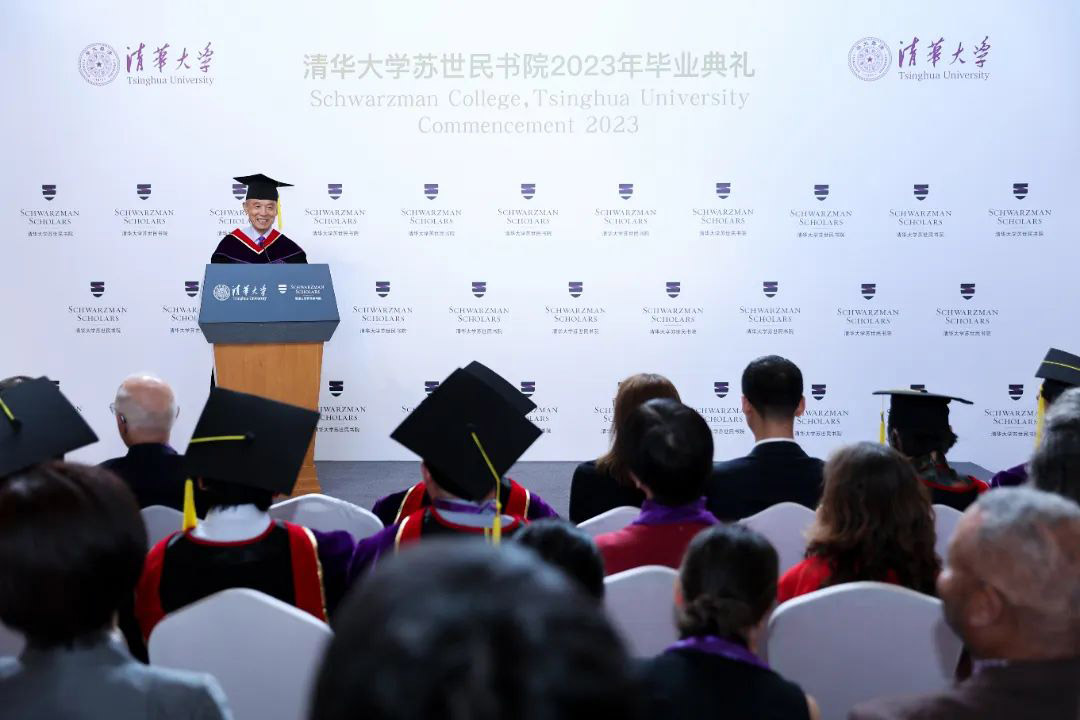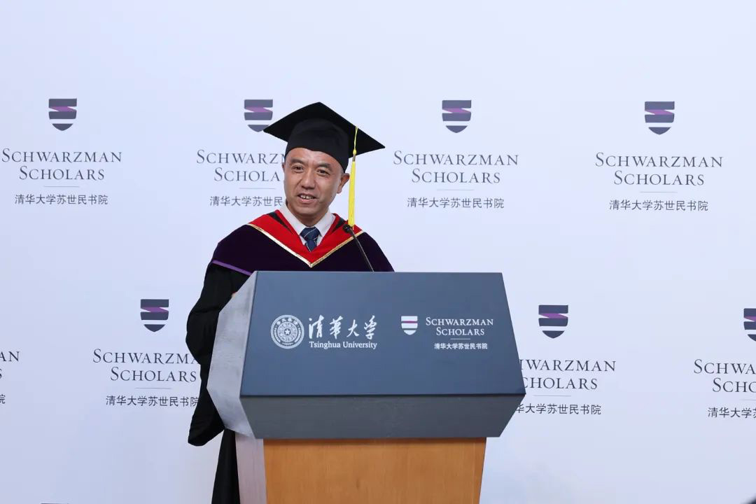 领导对书院自启动以来给予的支持和帮助。他表示,今年3月来到书院,很高兴聆听第七届苏世民学者在中国经历的难忘瞬间,大家积极投身于课程、研究和社交活动,亲身感受中国的变革与发展。苏世民对同学们在面对未知时展现出的沉着和好奇心表示赞赏,并希望大家将所学、所悟带到未来的人生旅程中。苏世民强调,书院的成功不仅在于学者们的优秀表现,更在于大家将所学的理念和价值观运用到日后的职业生涯中,成为引领世界变革的力量。他希望毕业生们保持全球视野,勇敢追求梦想,并通过合作与合力解决全球性挑战,为世界的未来做出积极的贡献。