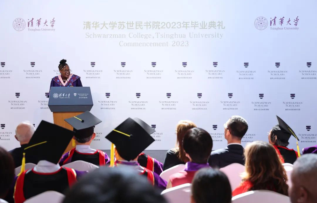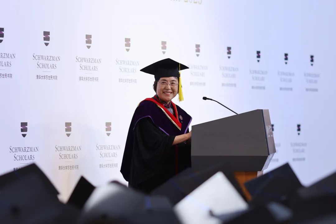 路易斯·理查森(Dame Louise Richardson)作为受邀嘉宾发表讲话。她首先对2023 届苏世民学者顺利毕业表示祝贺,并表示在近3000名申请者中脱颖而出,成为苏世民学者本身就是一项了不起的成就。每个学者都展现出非凡的领导力,对不同文化和观点的包容性,以及推动全球进步的决心和热情。路易斯·理查森对即将毕业的学者们提出了两个期望。首先,她希望同学们成为促进国际间相互理解的倡导者,通过全球网络的力量推动国际合作,解决气候变化、疾病、移民、食物安全、恐怖主义等跨国界问题。其次,她鼓励同学们成为教育的倡导者,为更多人提供高质量的教育机会,促进社会流动性和文化保护。