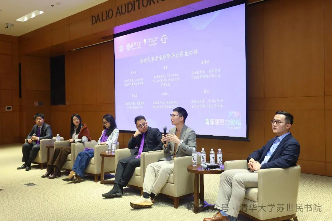 在讨论苏世民学者全球领导力时,世界经济论坛杰出青年北京社区下一届执委戴正主持会议。五位苏世民学者发表了精彩分享。第四届苏世民学者黄澈分享了她从纽约大学毕业后加入书院的经历以及目前从事的工作。目前,她专注于中国电商出海业务,以直播电商和短视频为例,强调了语言和讲述能力的重要性,并希望用更生动的方式传达中国故事。第三届苏世民学者潘芳迪讲述了自己的职业经历,更专注于帮助中国公司拓展海外市场。她认为中国的品牌在海外知名度不够的原因,是“人”的问题。她鼓励广大青年要有力量打破次元壁,走出舒适区。第三届苏世民学者苏靖轩分享了他在明星色情