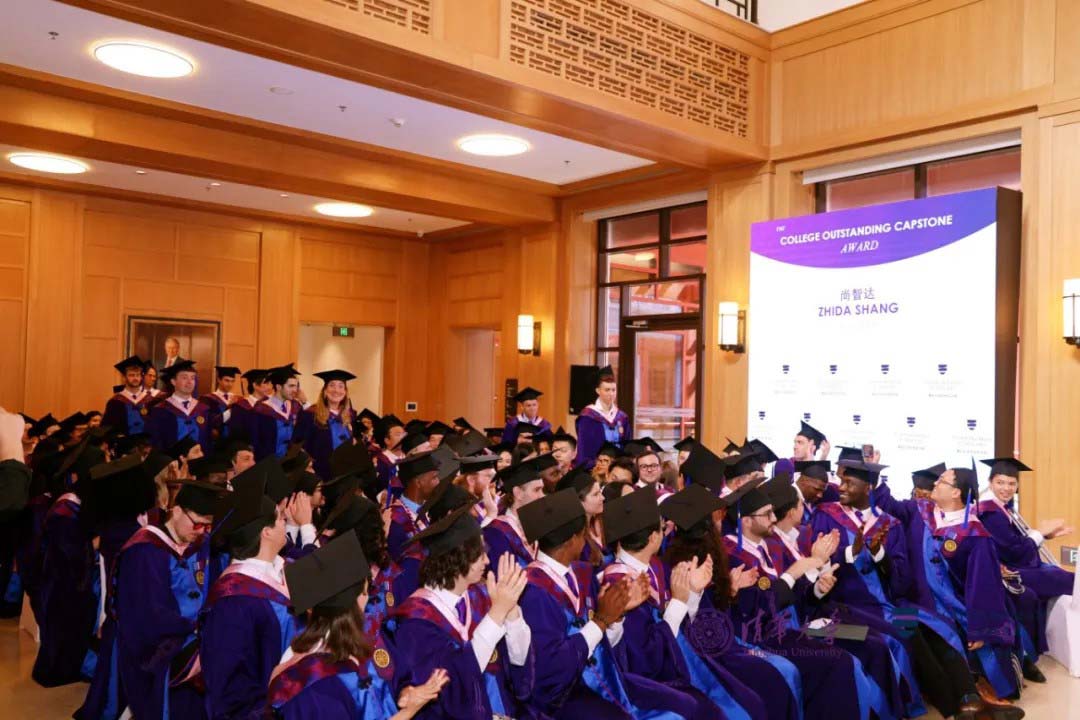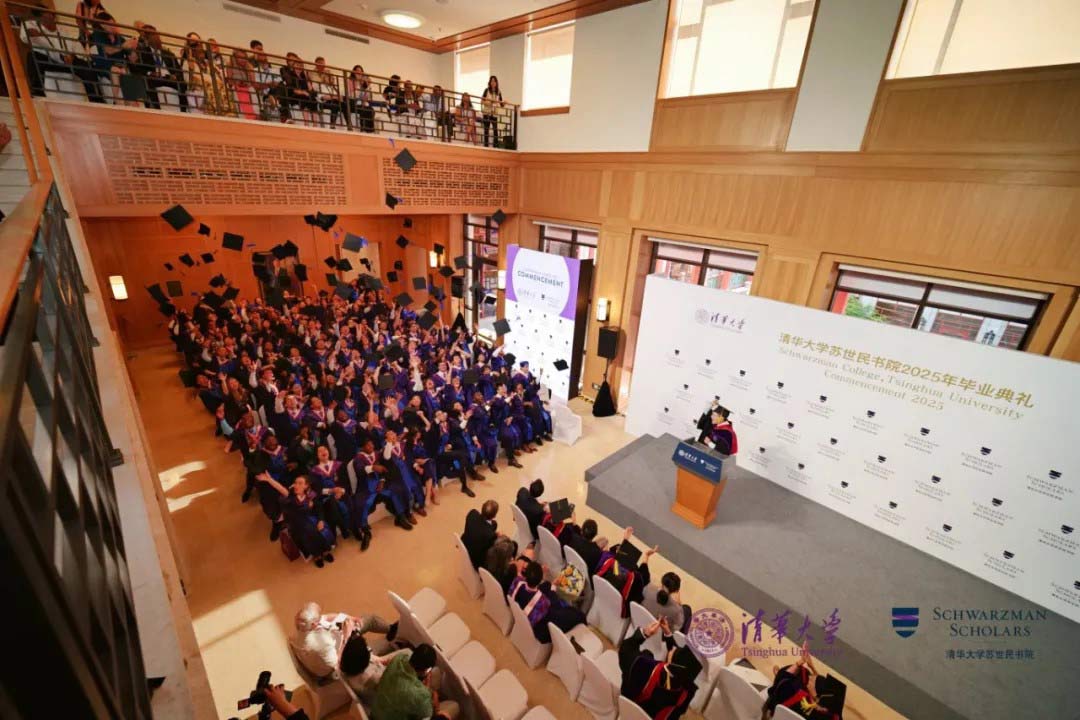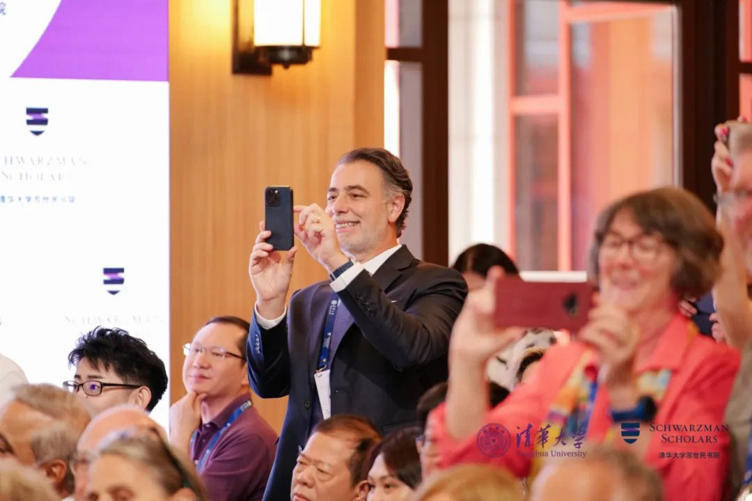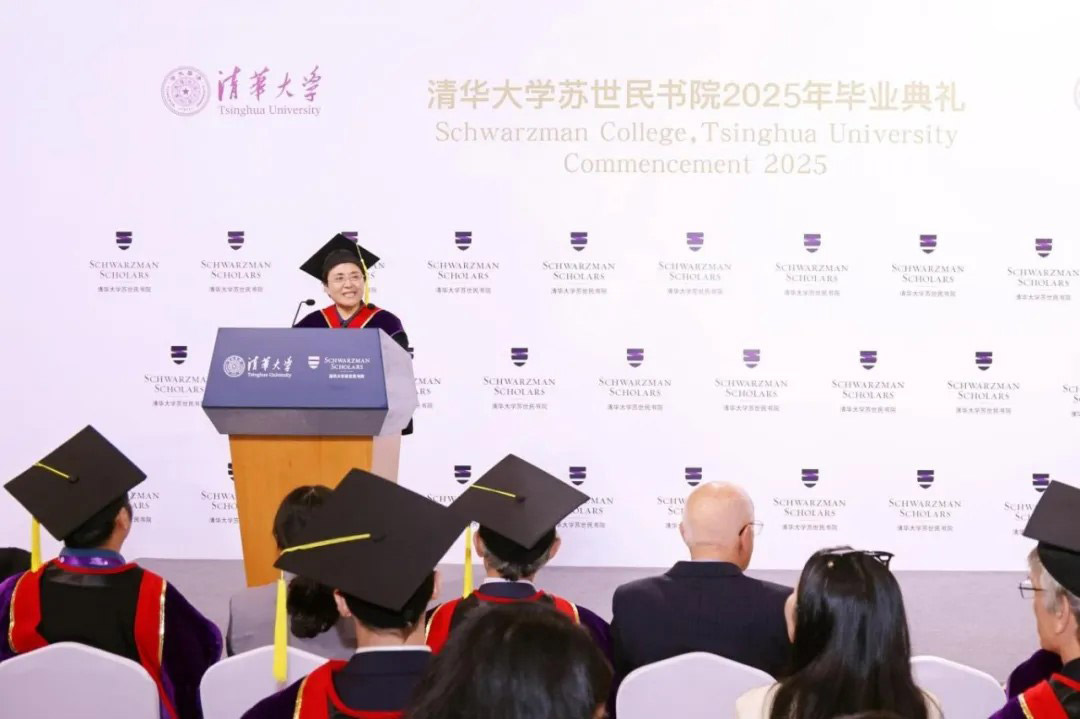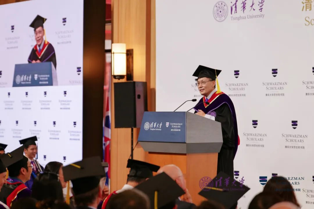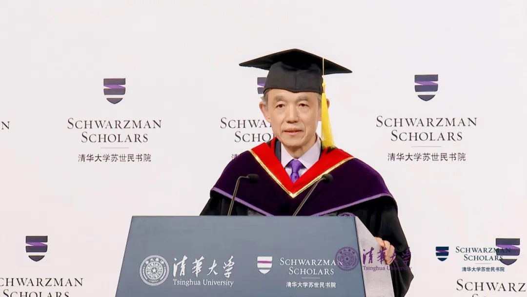 潘庆中以风趣生动的语言,回顾了本届学者的卓越表现,赞扬本届学者是Champion Cohort,他们不仅打破多项校内体育比赛的纪录,还深入体验中国文化,展现出强大的创造力与凝聚力。他提出,AI不仅代表着人工智能的技术,更体现在中文的“爱”(ai)里,苏世民学者应将智慧与温度结合,成为连接世界的桥梁。最后,潘庆中感谢所有家长、老师、教职工及清华各部门的辛勤付出和全力支持,并再次祝福所有学者毕业快乐。