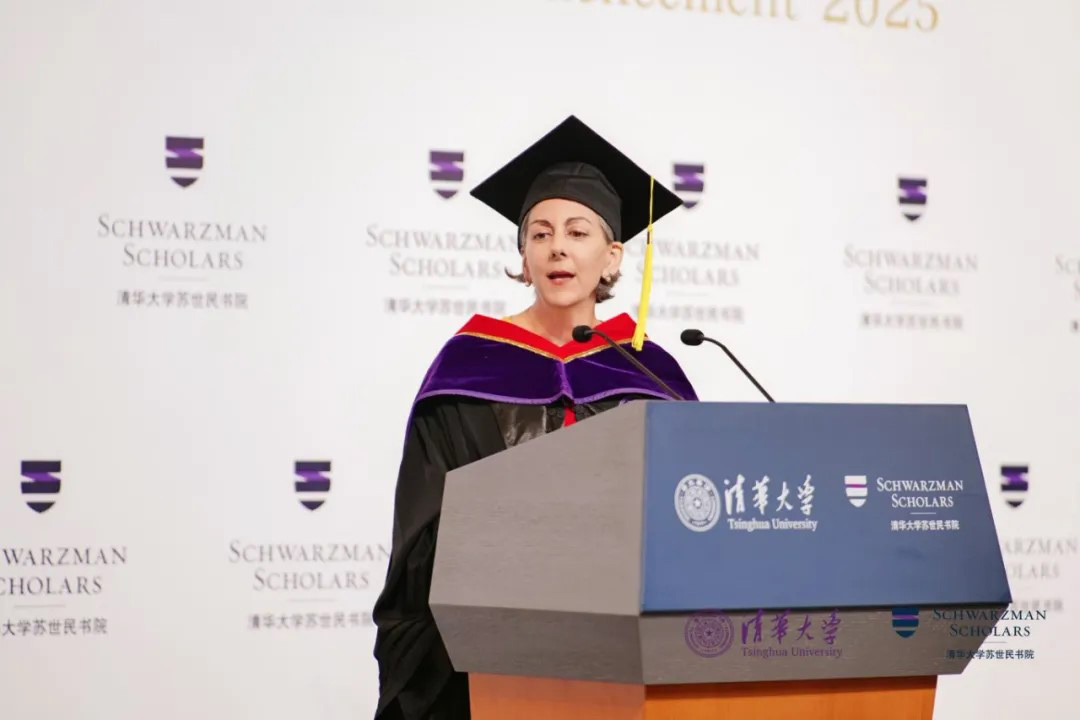 谢安敏(Amy Celico)向第九届苏世民学者表示祝贺。她表示,刚上任的这几个月内三次来书院,与众多学者进行深入交流,这些互动不仅帮助她快速适应新角色,也促使她思考如何在项目第二个十年中继续推动进一步发展。她寄语学者们在自己的领域里成为卓越的引领者,让世界变得更好,并鼓励大家在今后的道路上保持与书院及全球校友网络的紧密联系。